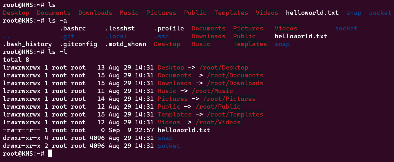 - ls : 특정 폴더에 포함된 파일이나 폴더 확인하기(list)